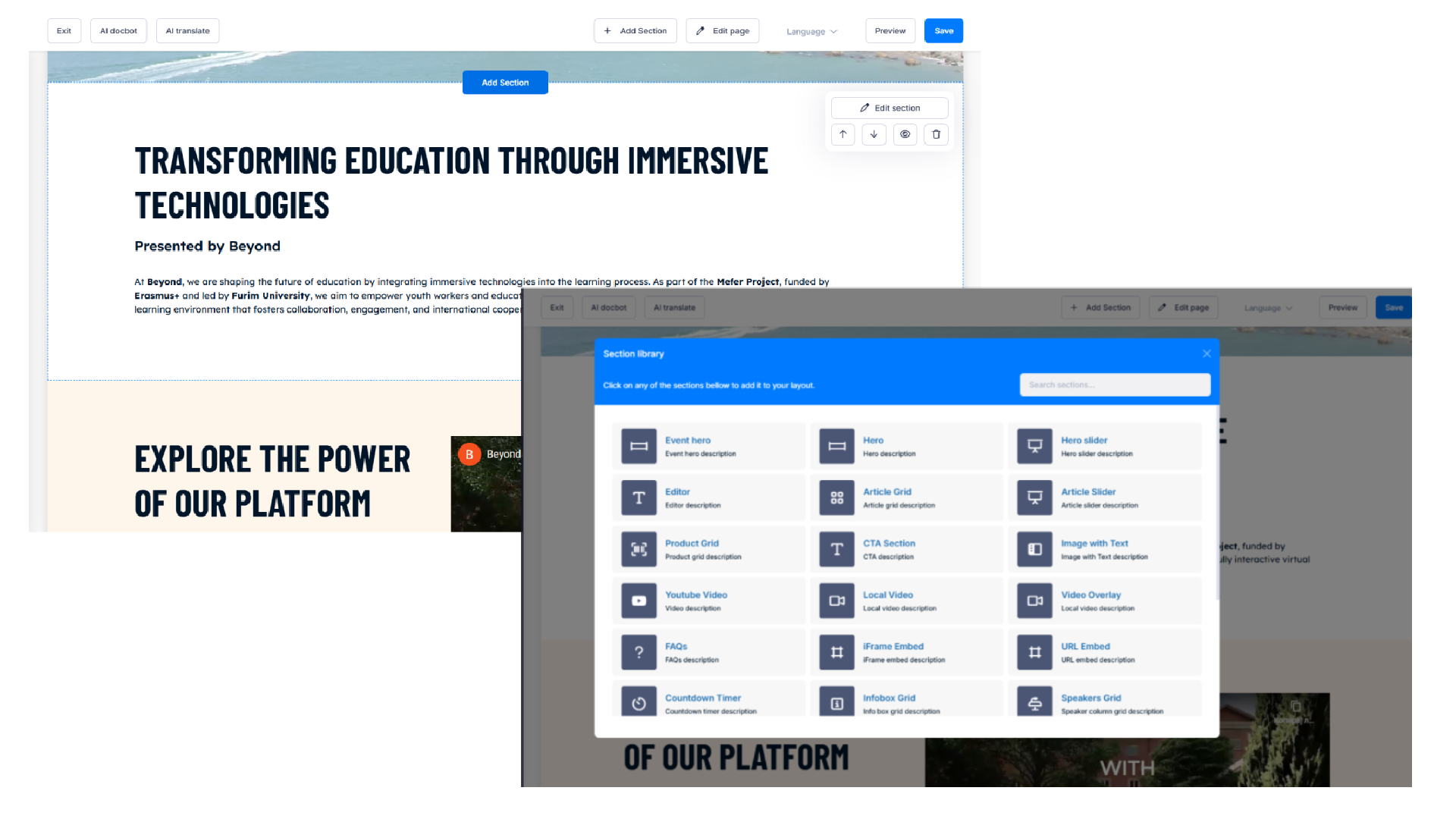 Our platform provides an intuitive Page Builder that allows users to easily create custom pages . Whether it's for showcasing courses, resources, or events, you can build fully interactive pages without any coding knowledge.