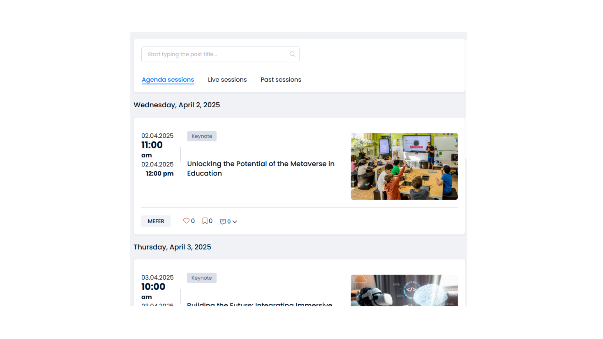 With our agenda feature, you can easily view current live sessions, check out the schedule for upcoming sessions. Stay informed and engaged with the full timeline of events in the Mefer Project .