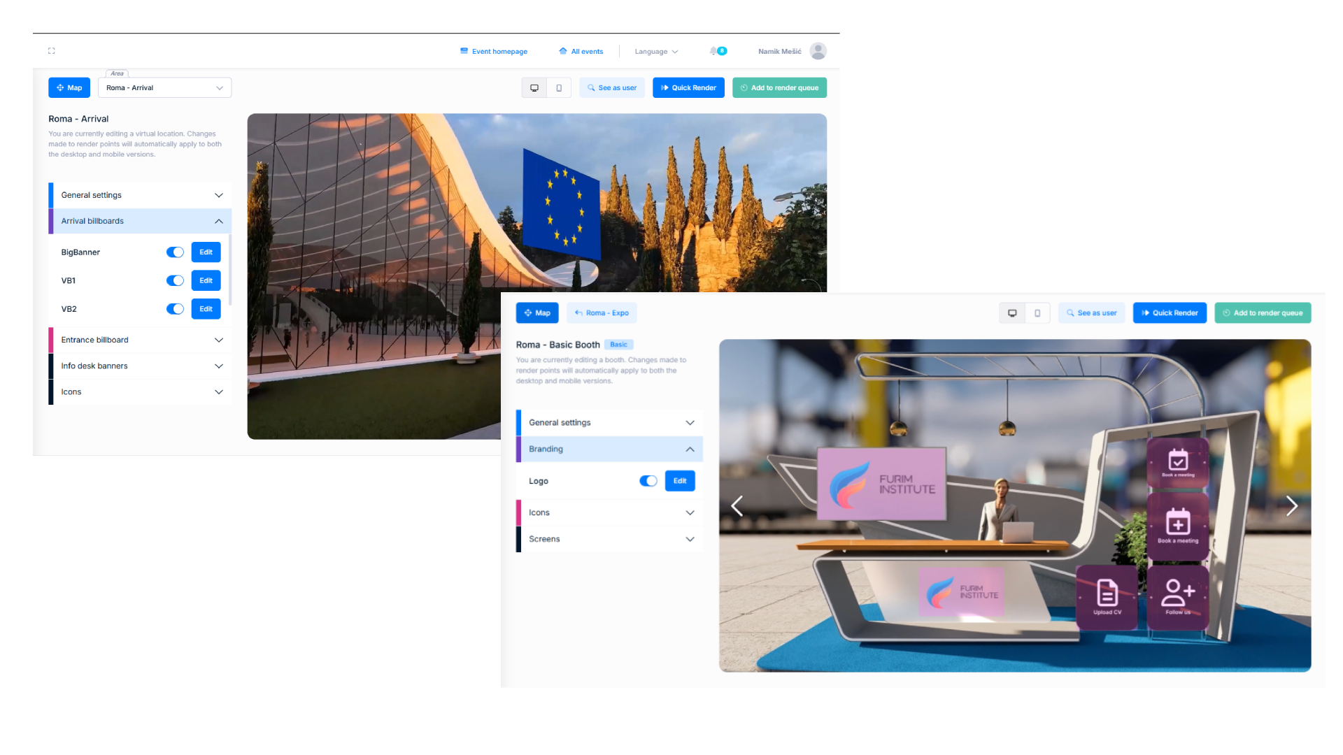 With the Venue Creator, users can quickly and effortlessly configure and customize virtual environments with just a few clicks. From designing arrival halls to setting up expo booths or a conference hall, this tool allows you to build immersive and interactive spaces tailored to your event's needs, all at the touch of a button.
